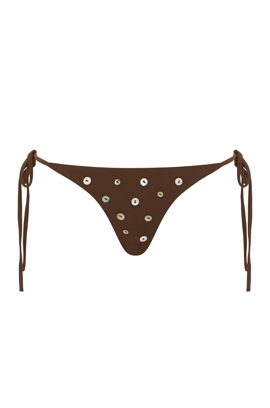 The Billie Bikini Top is a triangle-shaped top featuring shell button detailing.