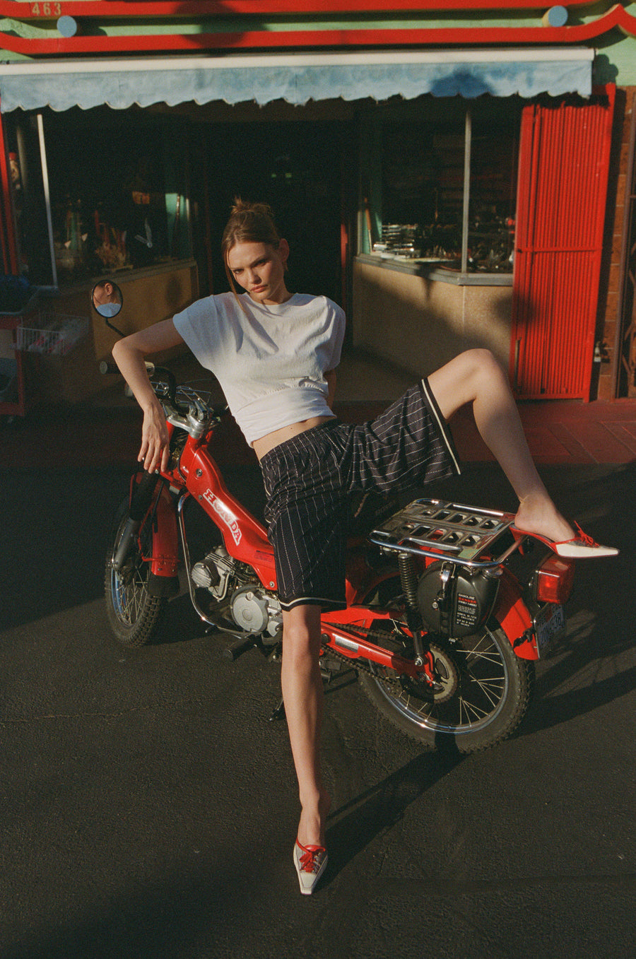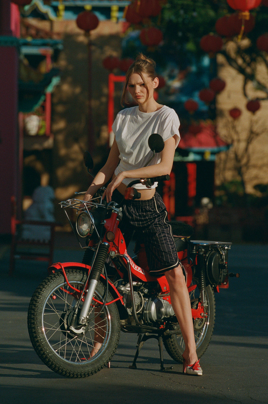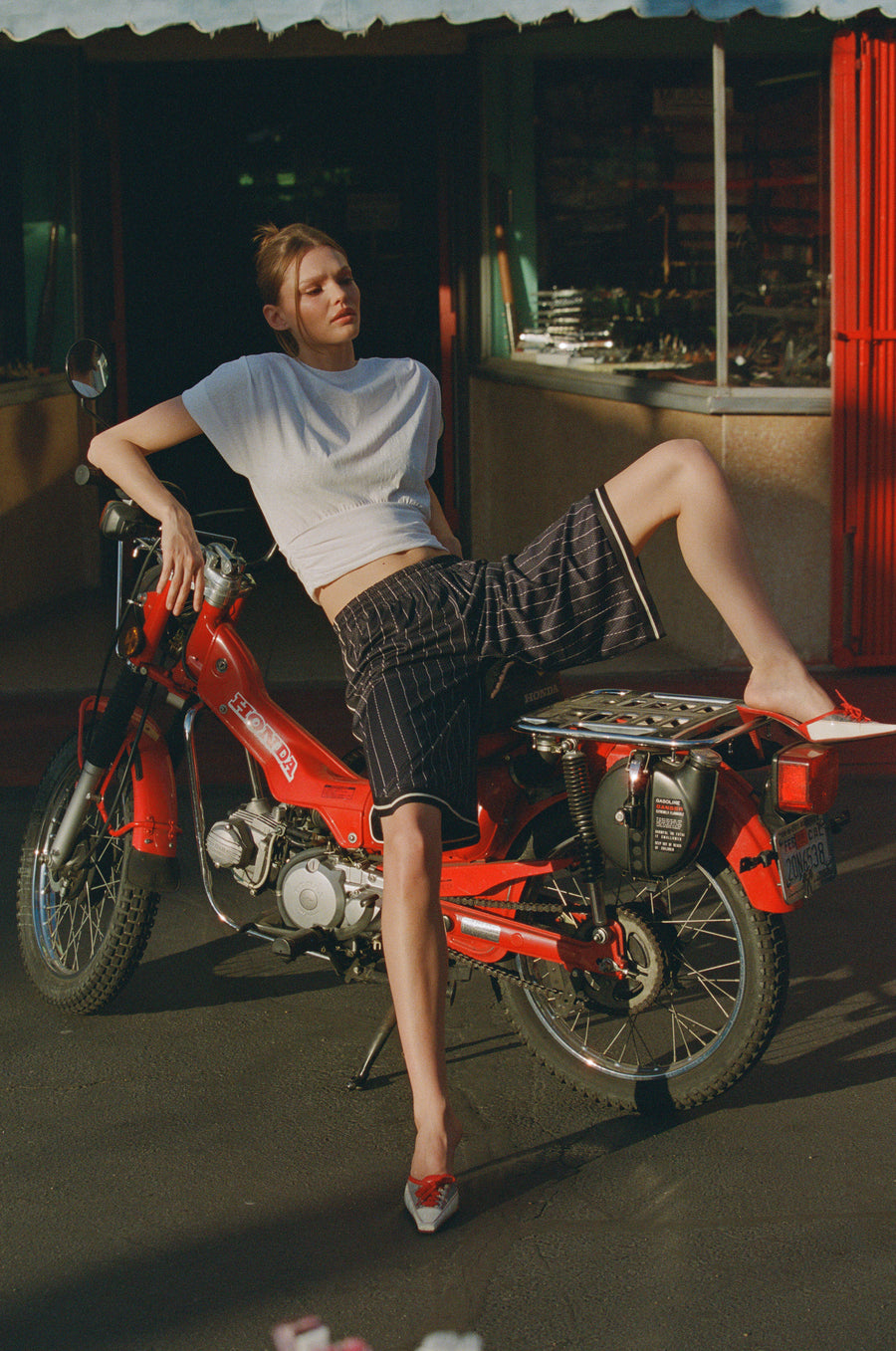 The King Jort is a relaxed, 3/4 pant featuring contrast taping along the hem and sides, with a custom perforated stripe print.