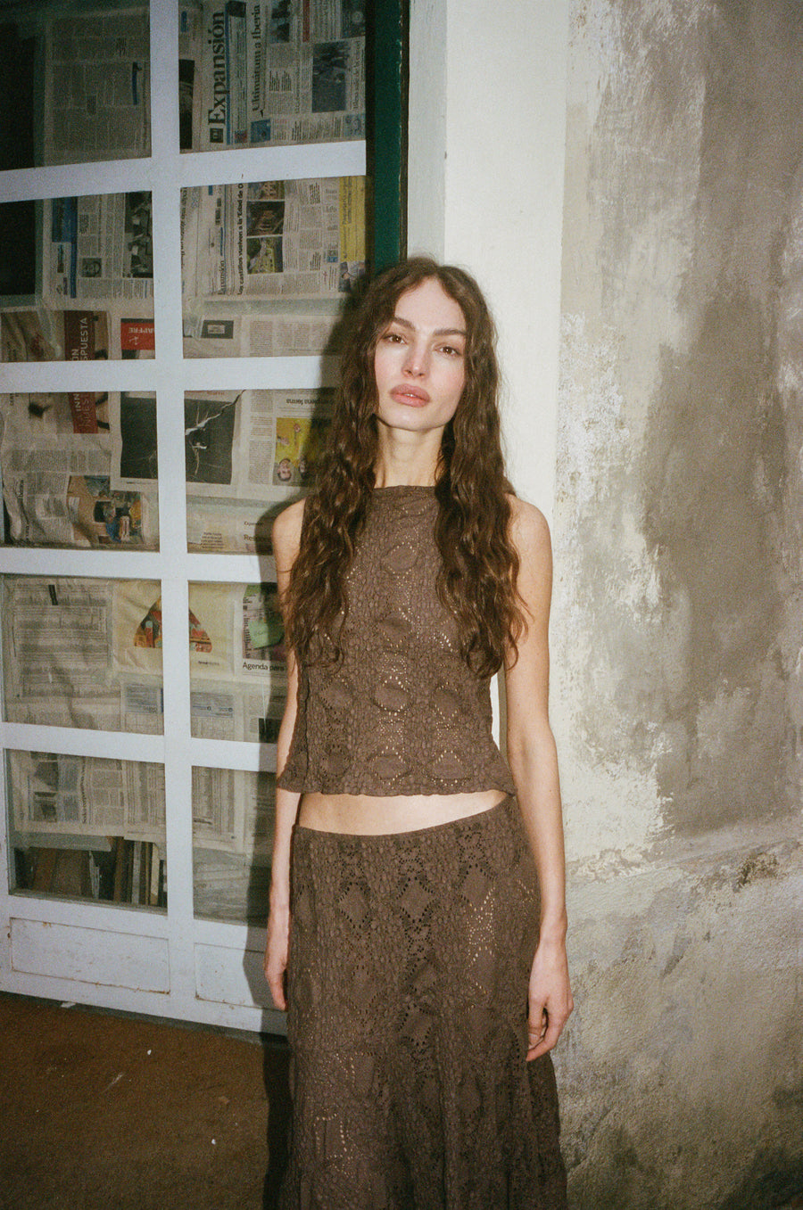 The Maeve Midi Skirt is a low rise, midi length skirt designed to be worn low on the hips featuring custom embroidery detailing throughout.