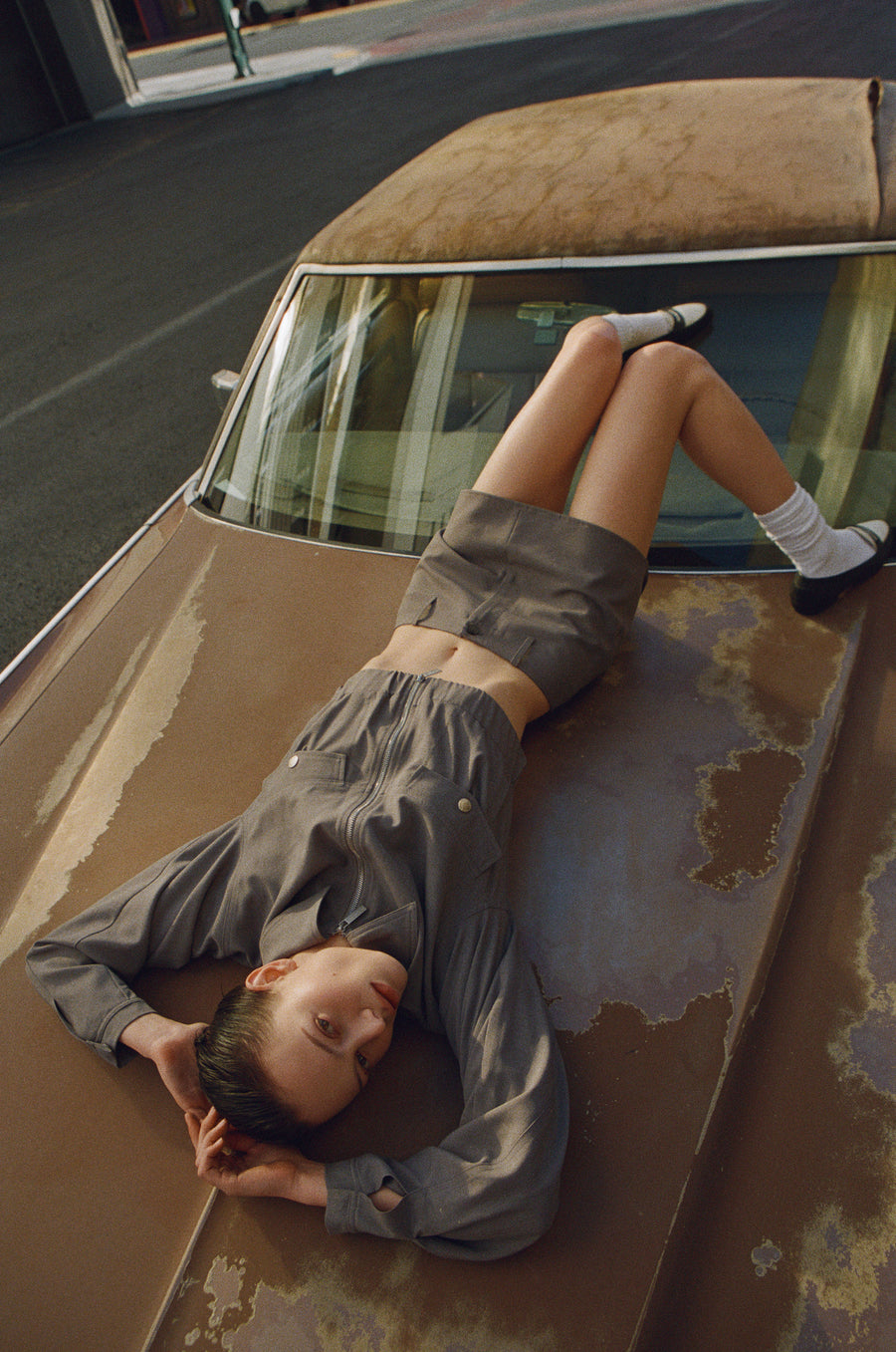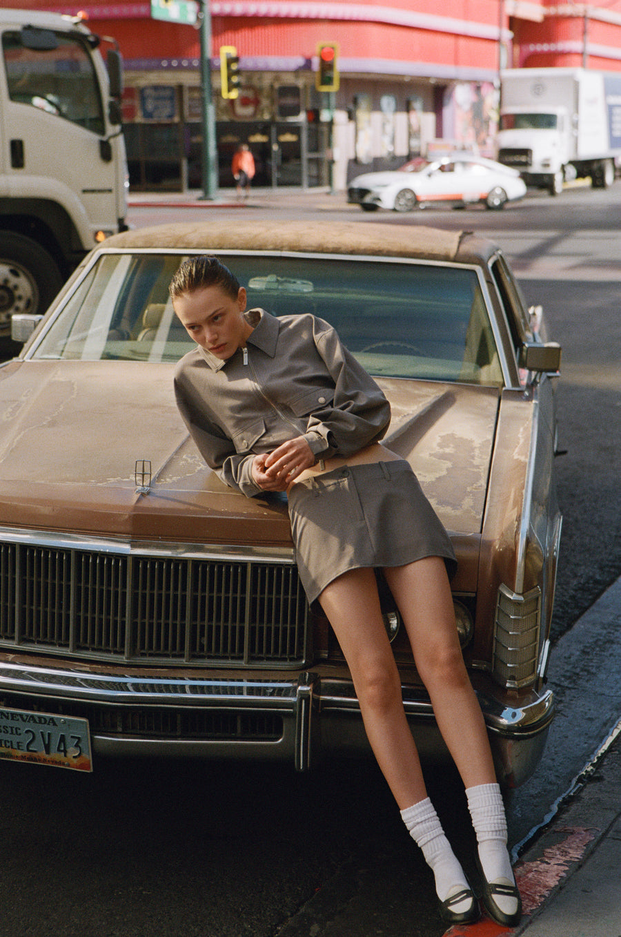 The Monroe Skirt is a low-rise mini skirt with belt loops and a front zip and button closure, featuring built-in shorts for added coverage.
