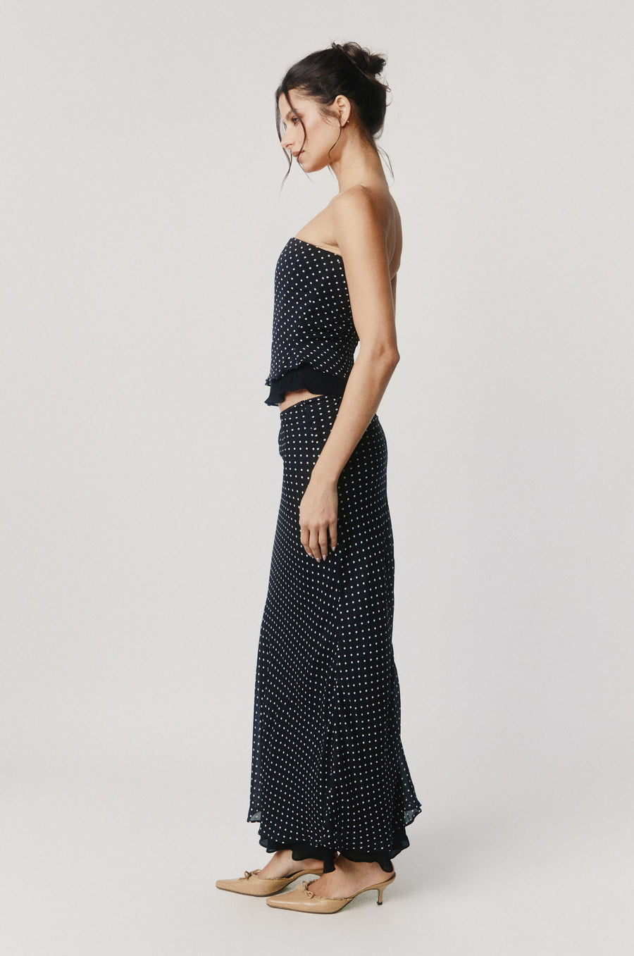 The Priya Skirt is a midi-length skirt featuring a picot-edged elastic waist and polka dot overlay.