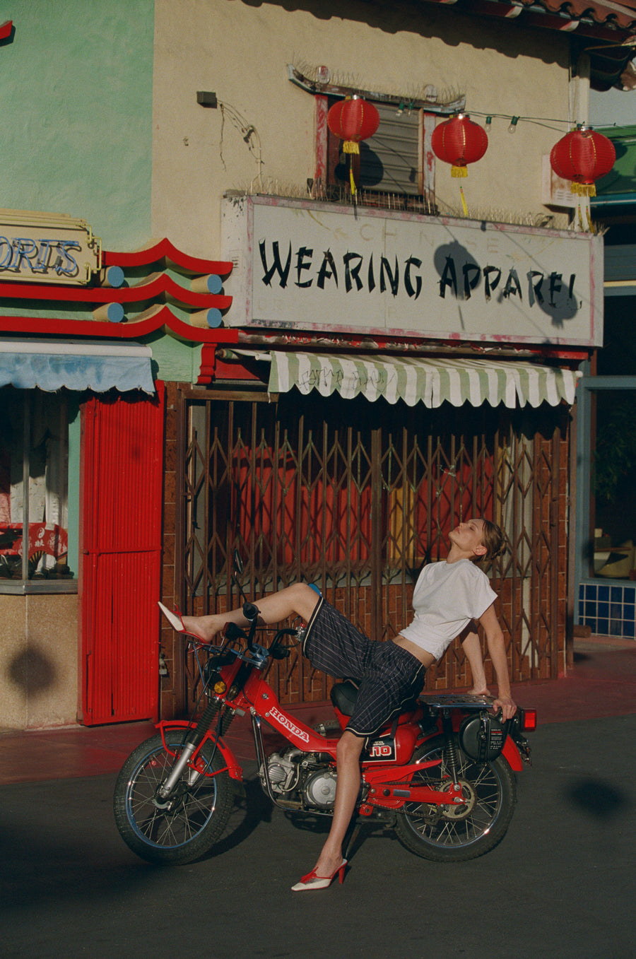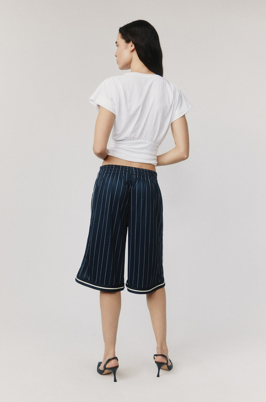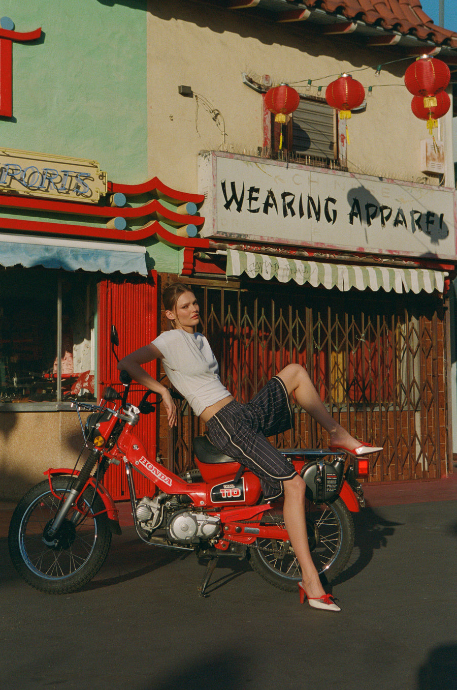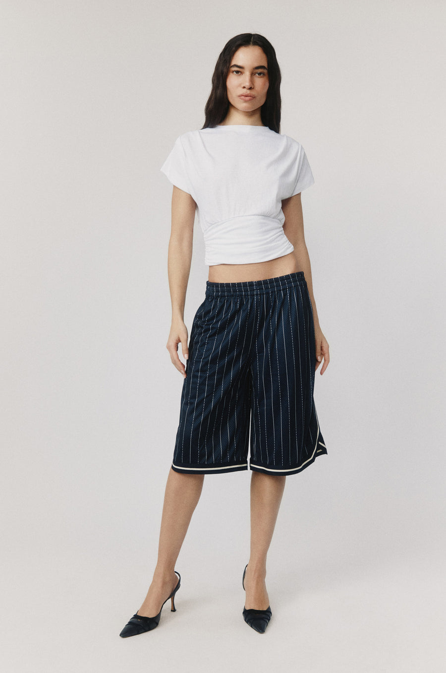 The Tammy Tee is a round-neck t-shirt with a relaxed fit, featuring ruched detailing at the waist, pleat detailing at the shoulders, and diagonal sleeves.