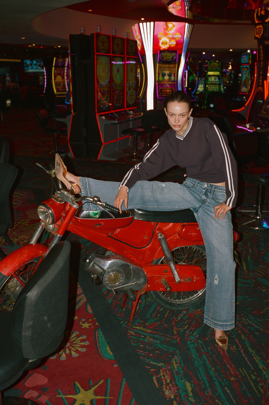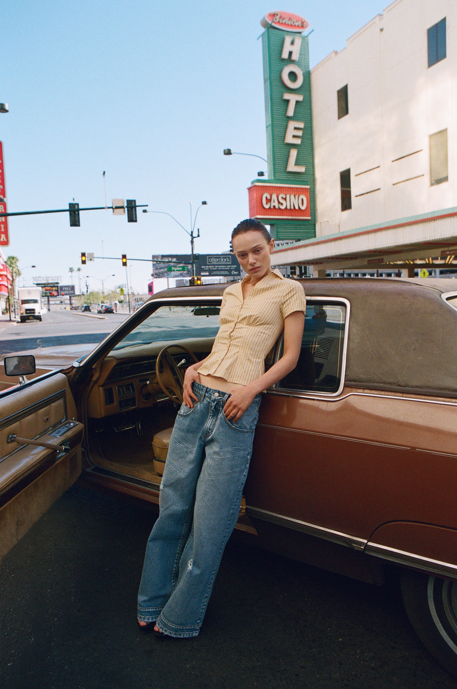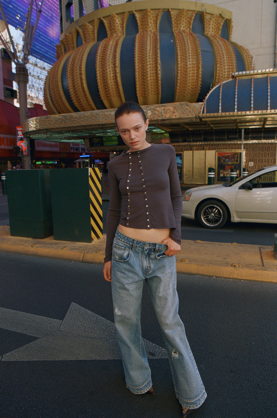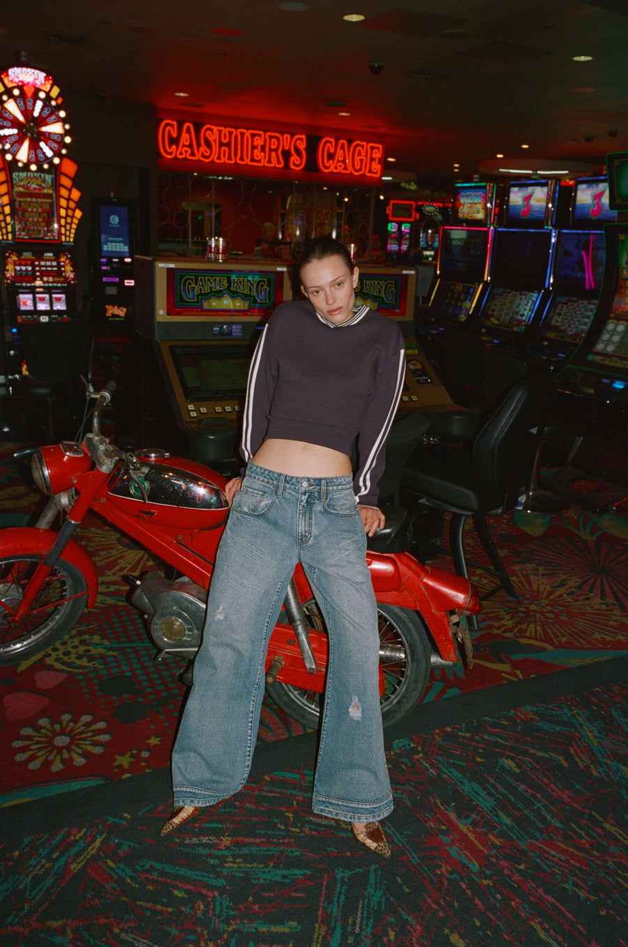 The Vinny Jeans are medium-rise, wide-leg jeans featuring front and back pockets, belt loops, a front zip closure, and a custom button.